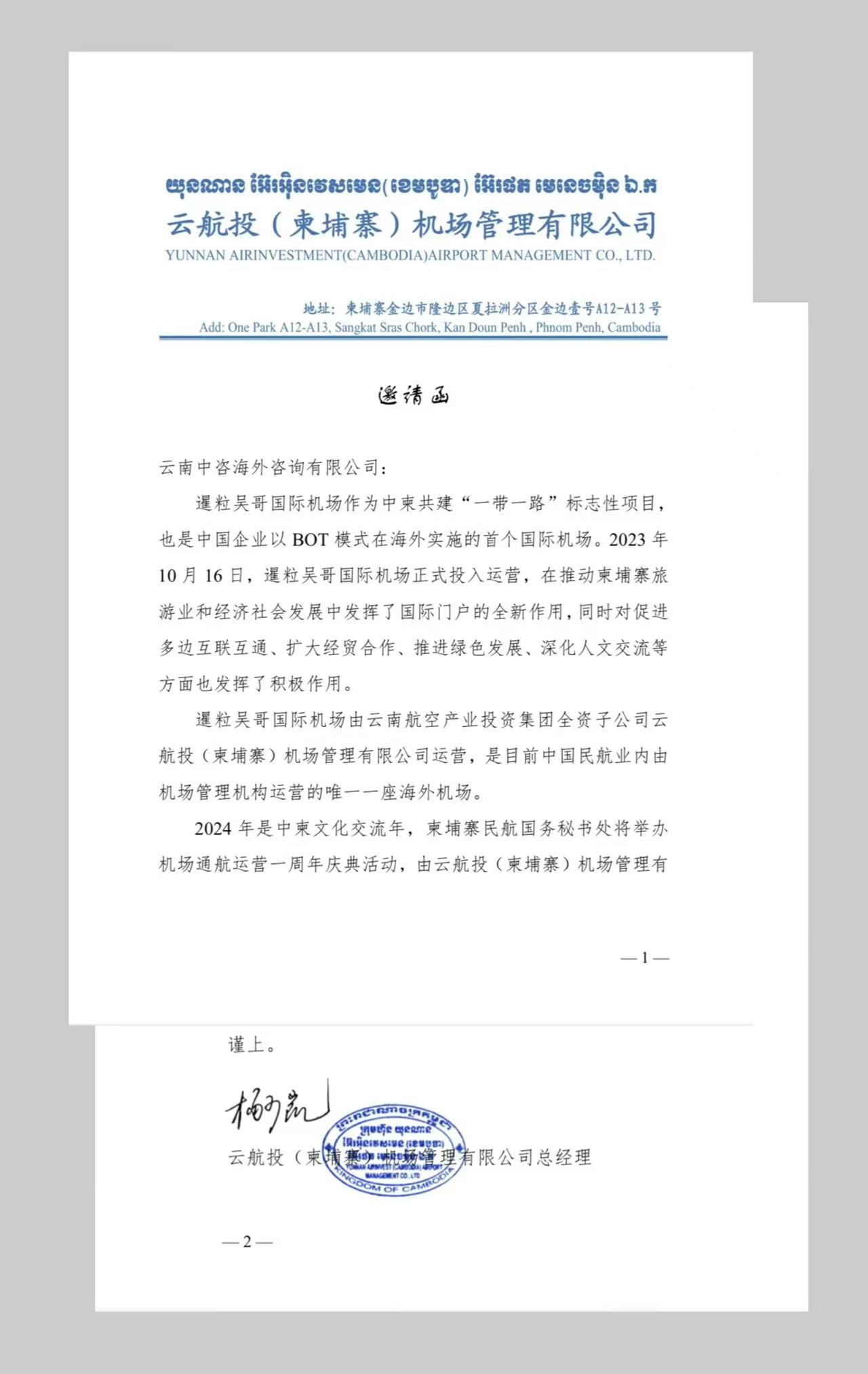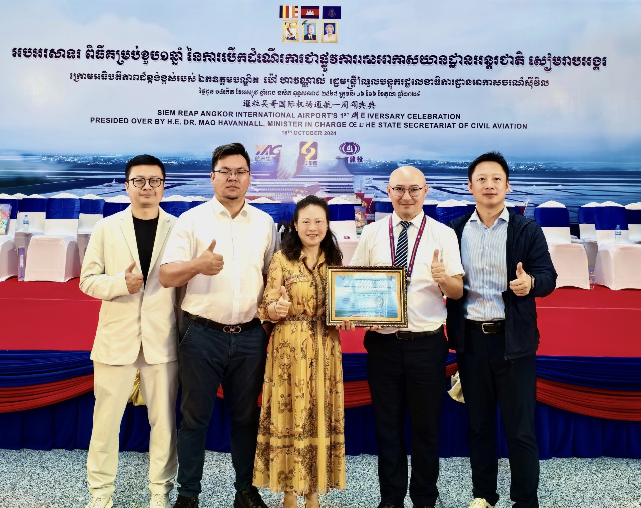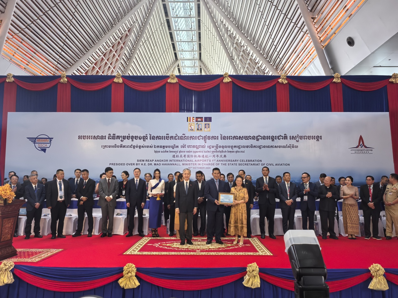 2024年10月16日,柬埔寨暹粒吳哥國(guó)際機(jī)場(chǎng)舉辦通航運(yùn)營(yíng)一周年慶典活動(dòng)。中國(guó)駐柬埔寨王國(guó)大使汪文斌,柬埔寨民航國(guó)務(wù)秘書處大臣毛哈萬(wàn)納(Mao Havannall),暹粒省省長(zhǎng)布拉索潘(Prak Sophoan),云南中咨海外咨詢有限公司董事長(zhǎng)亢麗毓、副總經(jīng)理王軍和李杰、部門副經(jīng)理周櫞杰及相關(guān)中方代表出席活動(dòng),柬埔寨王國(guó)政府相關(guān)部門官員及機(jī)場(chǎng)合作伙伴、航司及航空服務(wù)單位等近500人受邀參加活動(dòng)。